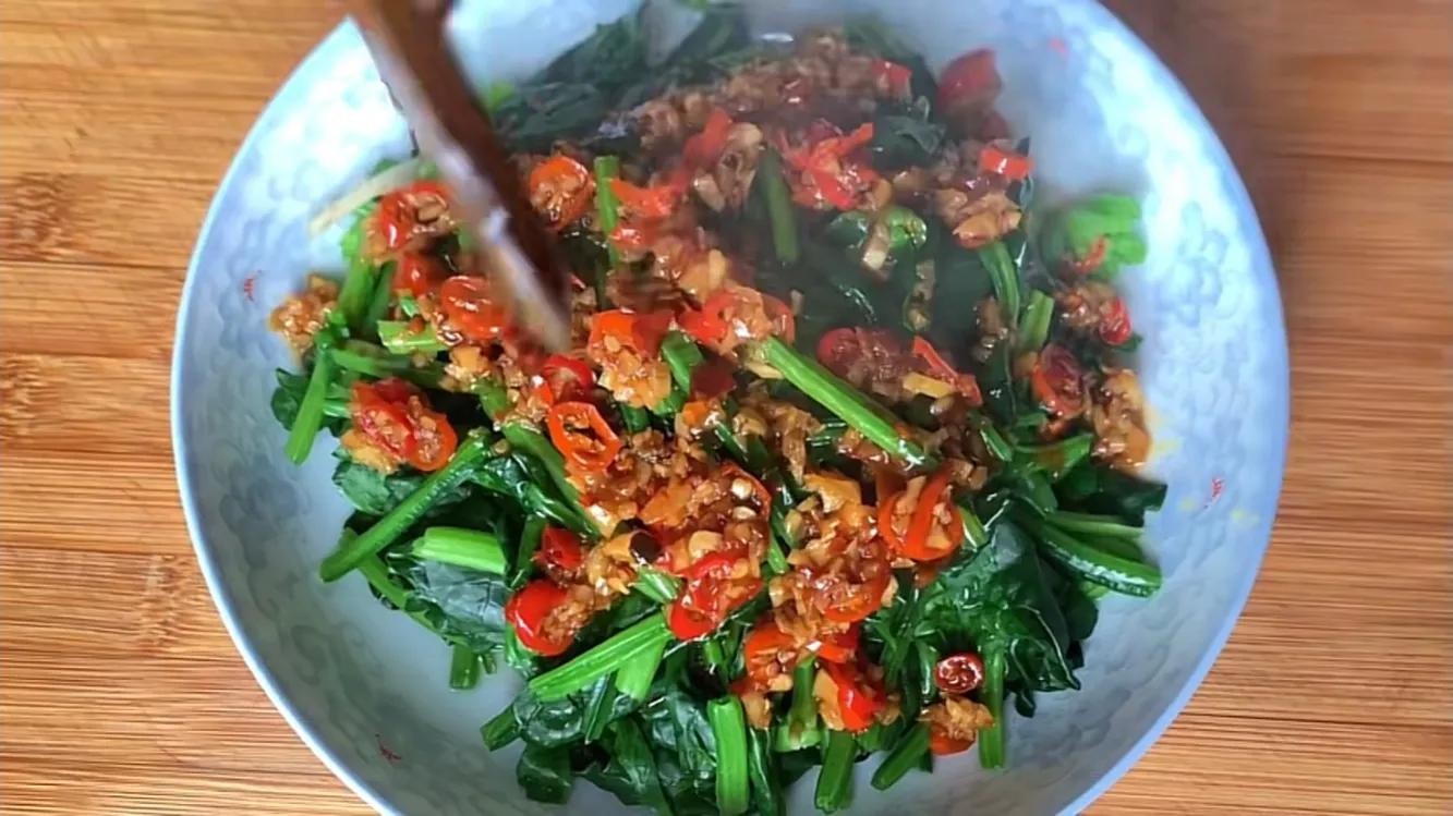 把料汁浇在菠菜上面,一道好吃的浇汁菠菜就做好了,这样做的菠菜爽口入味,健康无涩味,非常好吃。