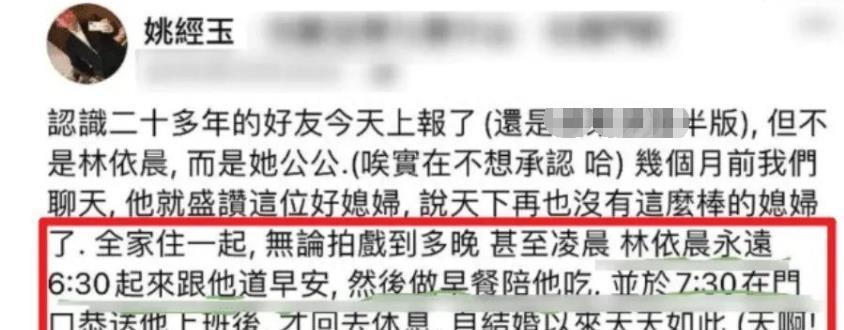 后来甚至有传言,林依晨每天早上6点30分起床去“问候”公公的婆婆,然后准备早餐,早上7点30分送公公去上班。
