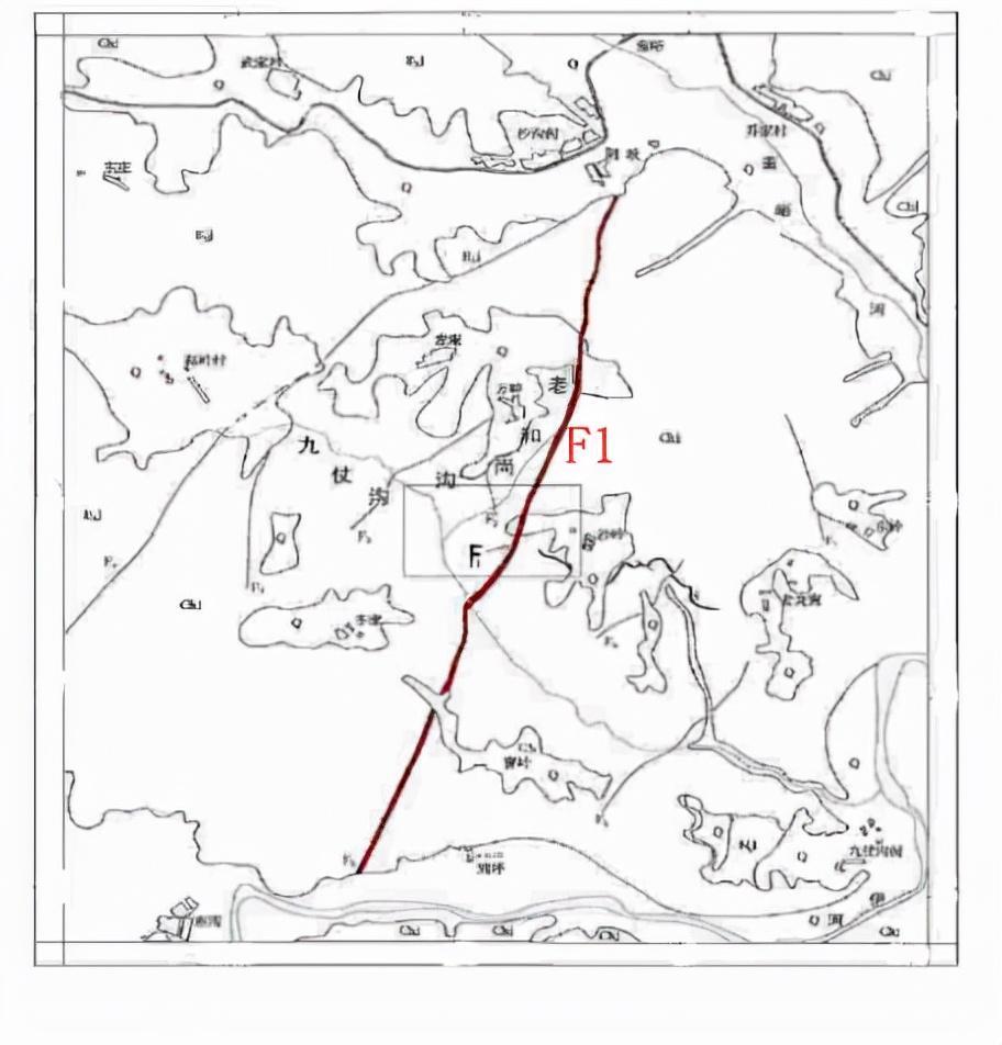 矿区内断裂构造主要为北北东向F1断裂,该断裂与南部马超营断裂相通。该断裂走向10—30度,倾向北西,倾角47—70度。北起阴坡,经老和尚沟、九仗沟、石板沟至刘坪西,断裂长度6公里,矿区内长度500m,该断裂为左行平移断层。该断裂蚀变构造带最宽达百余米,窄处5—10m,一般为30—50m,破碎带有内外蚀变带,其中内蚀变带宽约15m。F1断裂是矿区控矿构造。