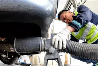 机动车辆服务公司的工作人员在对车辆进行排气污染检测