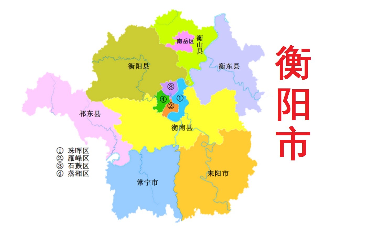 全市总面积15300平方千米,辖5个区(蒸湘区、珠晖区、雁峰区、石鼓区、南岳区 )、5个县(衡阳县、衡东县、衡南县、衡山县、祁东县),代管2个县级市(耒阳市、常宁市)。 截至2022年末,全市常住人口为657.74万人。
