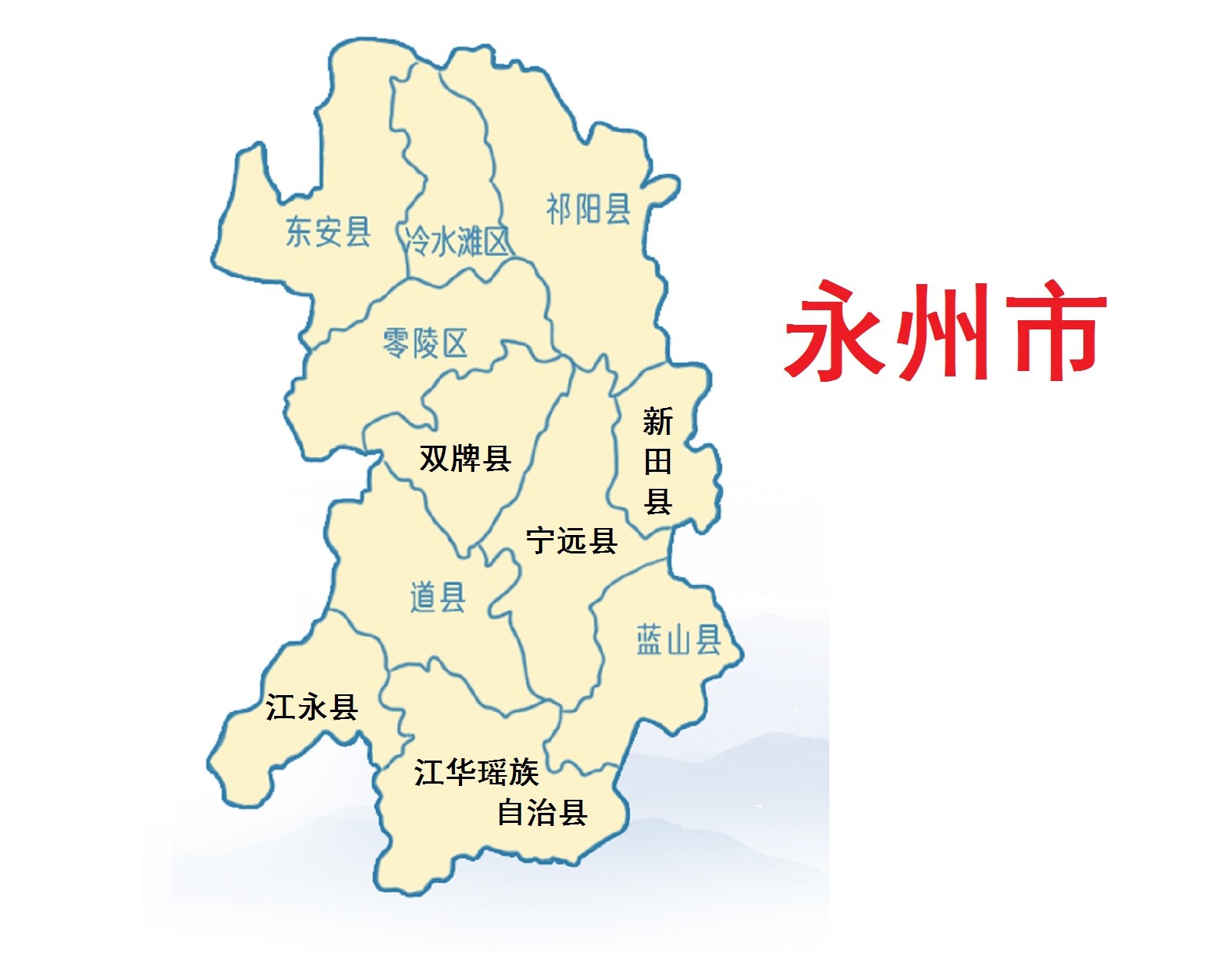 永州市总面积22259平方千米,辖2个区(零陵区、冷水滩区)、7个县(道县、江永县、宁远县、双牌县、蓝山县、新田县、东安县)、1个自治县(江华瑶族自治县)、代管1个县级市(祁阳市)。截至2022年底,永州市常住人口514.37万人。