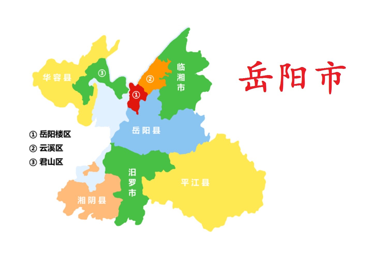 全市行政区域面积14858平方千米,下辖3个区(岳阳楼区、君山区、云溪区)、4个县(岳阳县、湘阴县、华容县、平江县)、代管2个县级市(汨罗市、临湘市)。截至2022年底,全市常住人口501.75万人。