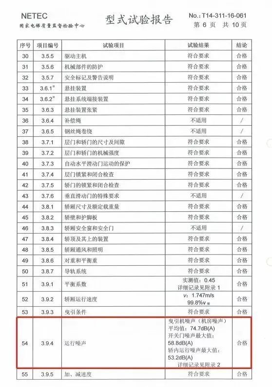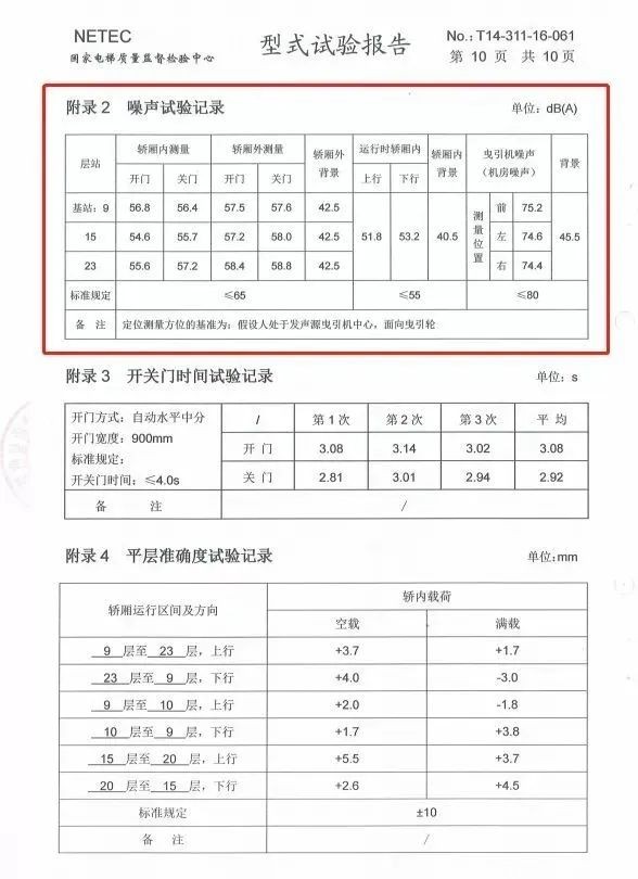 以西奥电梯为例,国家电梯质量监督检验中心出具的特种设备型式实验报告显示,加装电梯的相关运行噪声检测值均符合标准规定。