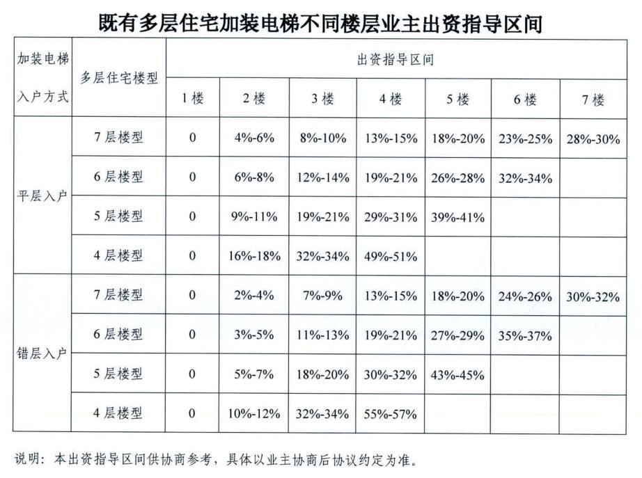 为促进居民统一意愿、达成共识,积极推动既有多层住宅加梯工作,2021年市增梯办发布了《既有多层住宅增设电梯不同楼层业主出资指导区间》。