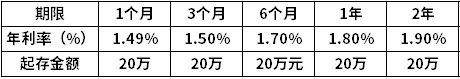 当前中国银行大额存单1个月利率为1.49%;3个月利率为1.5%;6个月的利率为1.7%;1年期的利率为1.8%;2年期的利率为1.9%。