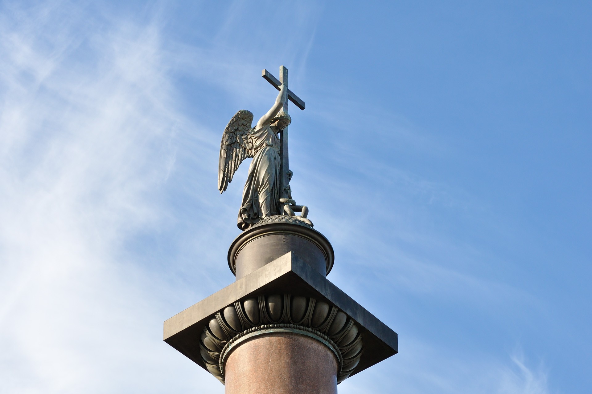 冬宫广场上的亚历山大柱顶的青铜天使,据说是按亚历山大的面孔建造