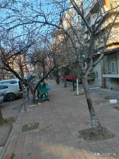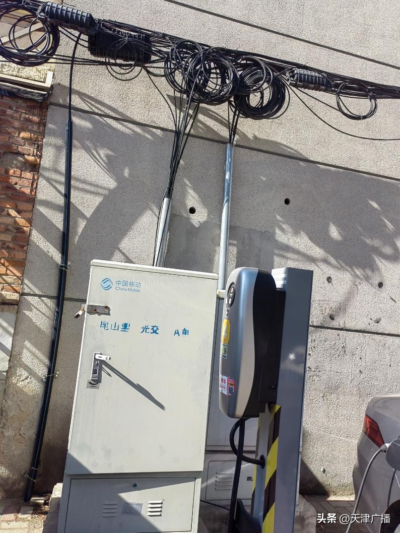 昆山里小区位于河北区江都路街乐山里社区,是上世纪90年代建成入住的老旧小区,小区里都是5——6层到顶的楼房,没有地下车库。居民们的汽车都停在小区的空地上。回先生所说的这六个充电桩,距离楼体不过半米,在充电桩的上方,还有小区的供热管道和电线。
