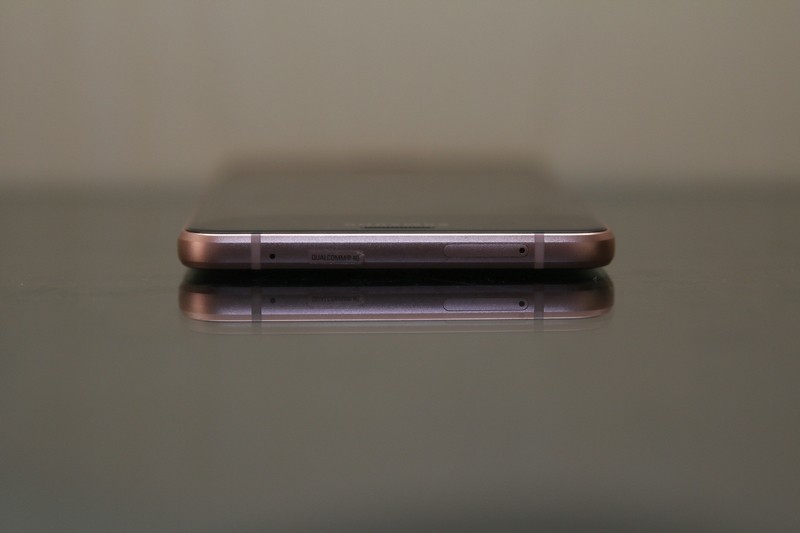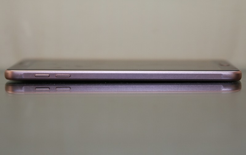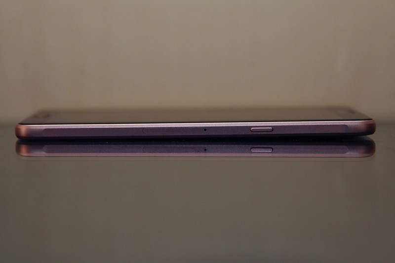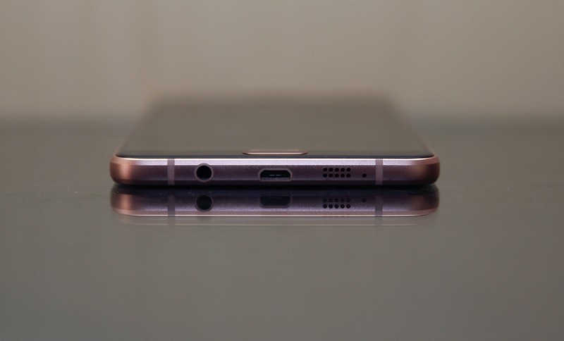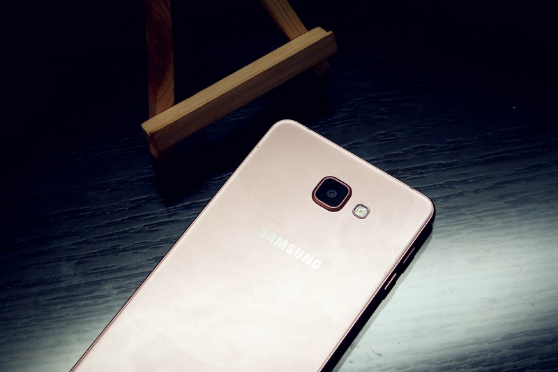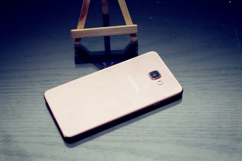 小狐拿到的是玫瑰金版,边框与背面均采用了玫瑰金配色,边框采用流行的金属设计;另外在边框的结构设计上三星Galaxy A9(A9000)也沿用了类似Galaxy S6那样的四角加固的设计,可以在意外跌落时提供一定程度上的对屏幕的保护。