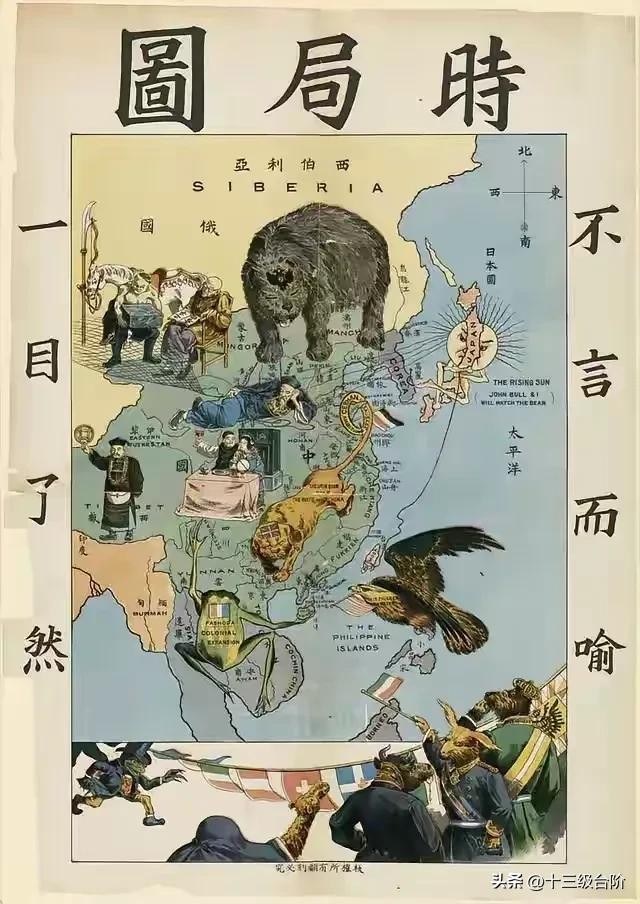 也许也就是从那时起,对西方建立起文明秩序的期待彻底毁灭,也成为近代中国开始奋发图强的起点,而巧合的是当时中华大地上,一张“时局图”也非常流行。图中,中国的东南西北也在被各种动物包围着,背后的寓意同样不言自明。