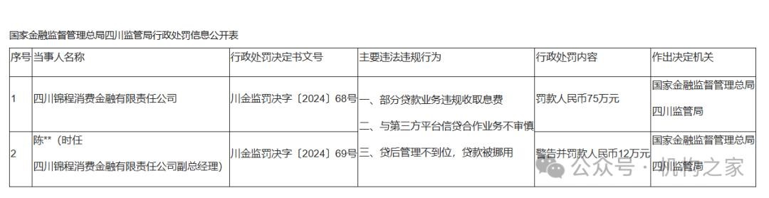 这一系列问题的积累,也导致了监管的关注。2024年12月20日,国家金融监管管理总局四川监管局因锦程消金在部分贷款业务中存在违规收取息费、信贷合作审慎性不足以及贷后管理不到位的情况,决定对其处以75万元人民币的罚款。此外,时任副总经理陈炳国也因涉及上述违规事项,受到监管警告,并被罚款12万元人民币。该事件不仅暴露了锦程消金在风控和合规管理方面的短板,也进一步突显了渠道中介管理的复杂性和潜在风险。