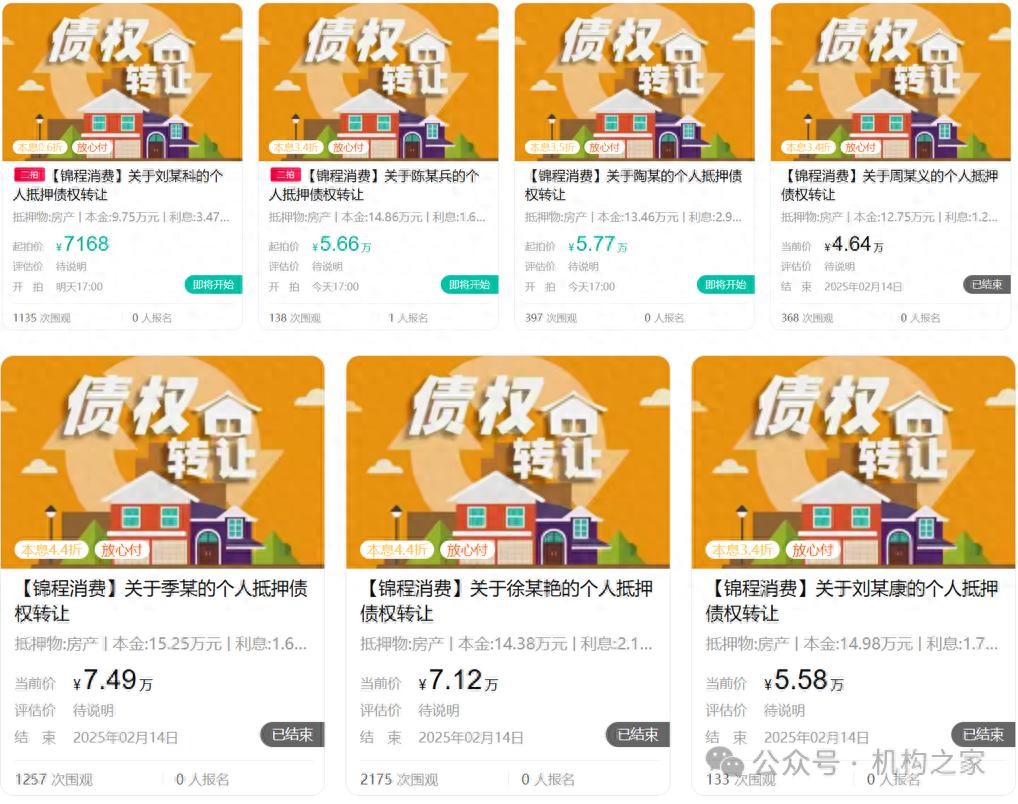 尽管如此,锦程消金依旧将阿里拍卖作为其主要的个人抵押债权处置渠道。截至目前,锦程消金已发布了28,069条个人抵押债权转让信息,其中部分仍在拍卖中,抵押物主要为房产,拍卖价格涵盖了从债权本息的0.5折至6.2折不等。这一系列低价甩卖数万条个人债权的举措,显现了其面临的债务处置压力,尤其是抵押贷款的贷后问题。