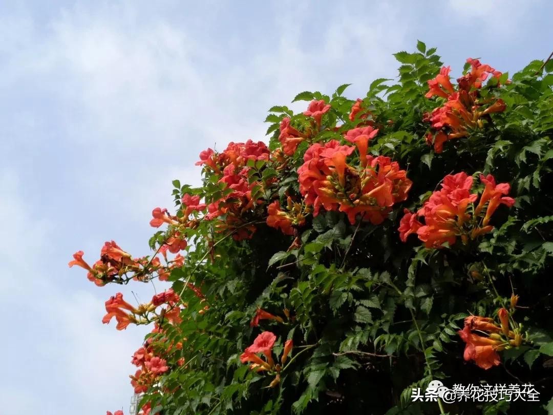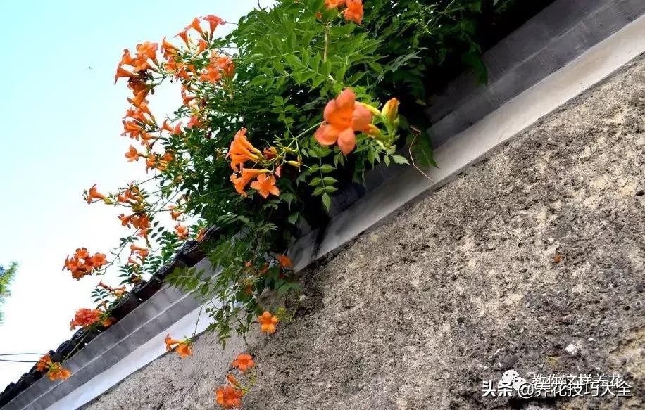 凌霄花美丽大气,适应性很强,而且和白墙黛瓦十分相配,盛开的凌霄花,像一小串的小风铃,翠叶团团如盖,枝干虬曲多姿,美丽动人。