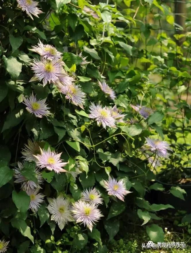 铁线莲被称为藤本花卉皇后,花型丰富多样,花色美丽繁茂,绽放如莲,仙气缭绕,不少人都被铁线莲的美丽征服。铁线莲一般开蓝紫色、白色花朵,病虫害比较少,不管在阳台还是院子里都很适宜。相对比较耐寒,适合南北方的花友种植。