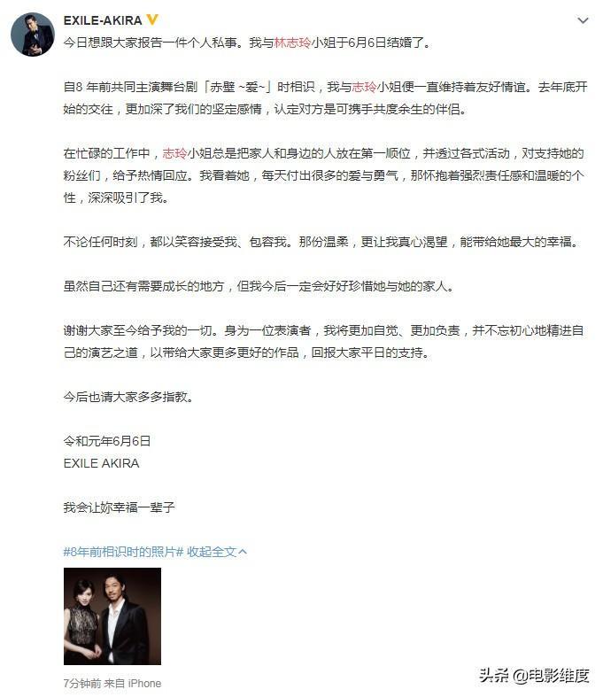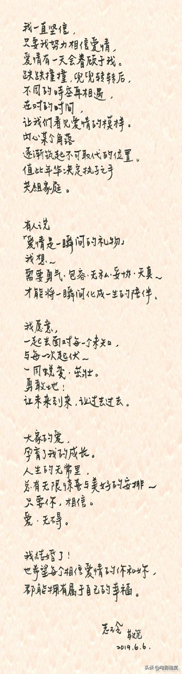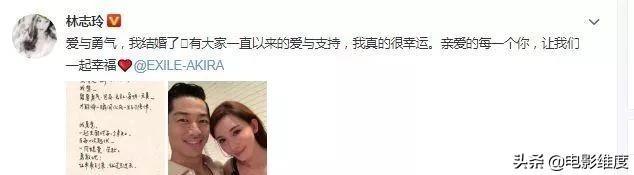 林志玲今日突然在微博发文:爱与勇气,我结婚了,有大家一直以来的爱与支持,我真的很幸运。亲爱的每一个你,让我们一起幸福。
