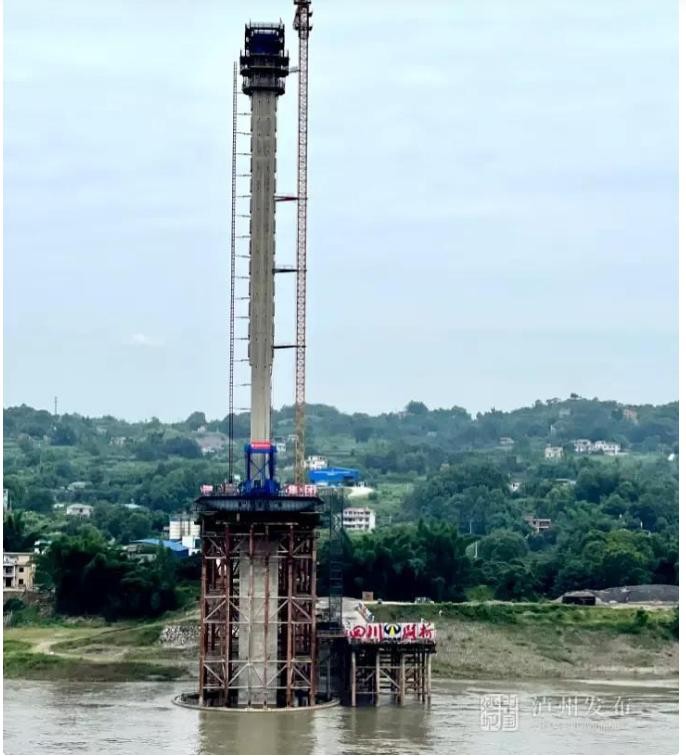 2022年6月7日,泸州市白沙长江大桥北岸主塔顺利完成封顶工作。泸州市白沙长江大桥北岸主塔作为 全桥控制性工程,高162.83米,相当于54层楼高,浇筑混凝土总方量约为9500方,主塔设计采用独柱结构形式,由防撞区、非防撞区、非锚固区、锚固区以及弧形塔冠五个部分组成。