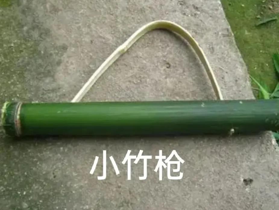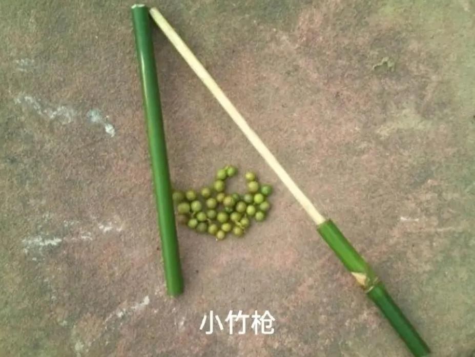 顾名思义就是用竹子做的枪,有很多种型号,各式各样的,做法也是非常简单的,农村的小孩基本上都会做。竹枪的子弹也是多样的,有的豌豆,红豆,绿豆,植物的果实,桃核,小石子,纸疙瘩,水,等,如下图所示:
