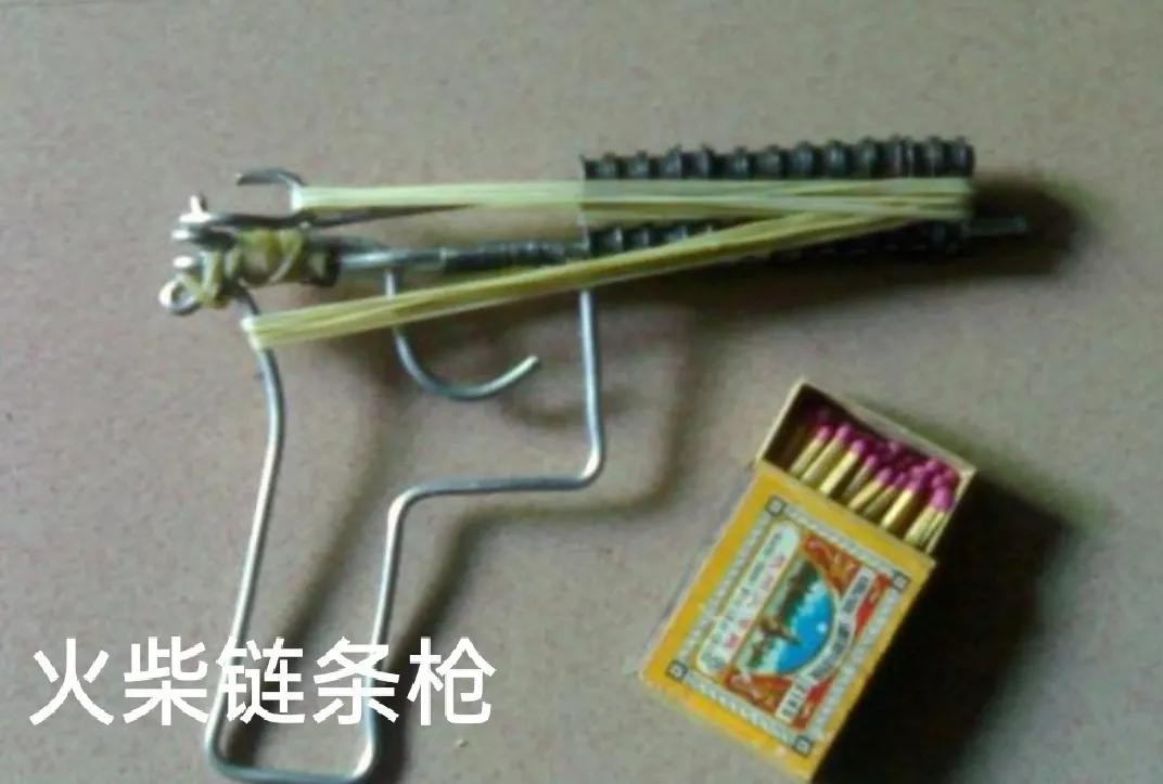 这个就不是那么容易做的,有一点点的难度,就是用一些废旧的自行车链条和铁丝,加上一些橡皮筋做出的一种枪形玩具,把火柴头装上去打,不但能发出啪啪的响声,还能看见火花。