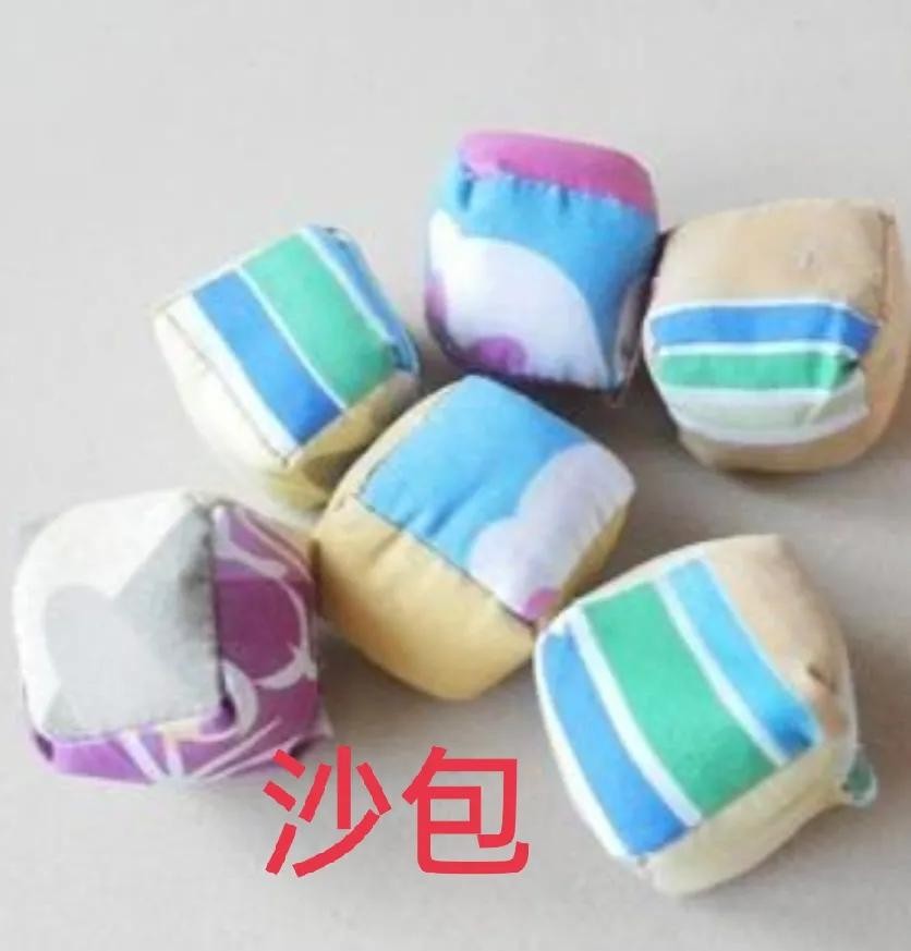 这种玩具要几个人配合着一起玩才有意思,一个人只能踢沙包,人多了可以打比赛。这种沙包一般都是拳头那么大,把五谷杂粮缝在布里面,缝成圆形或是四方形。