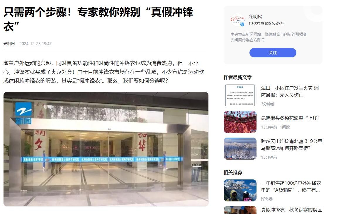 《只需两个步骤!专家教你辨别“真假冲锋衣”》——光明网