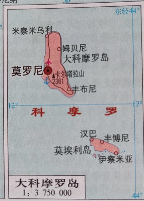 【行政区划】 分为大科摩罗、昂儒昂和莫埃利三个自治岛。岛下设县、乡、村,三岛分别有7个、5个、3个县,共24个乡。马约特岛现为法国控制。