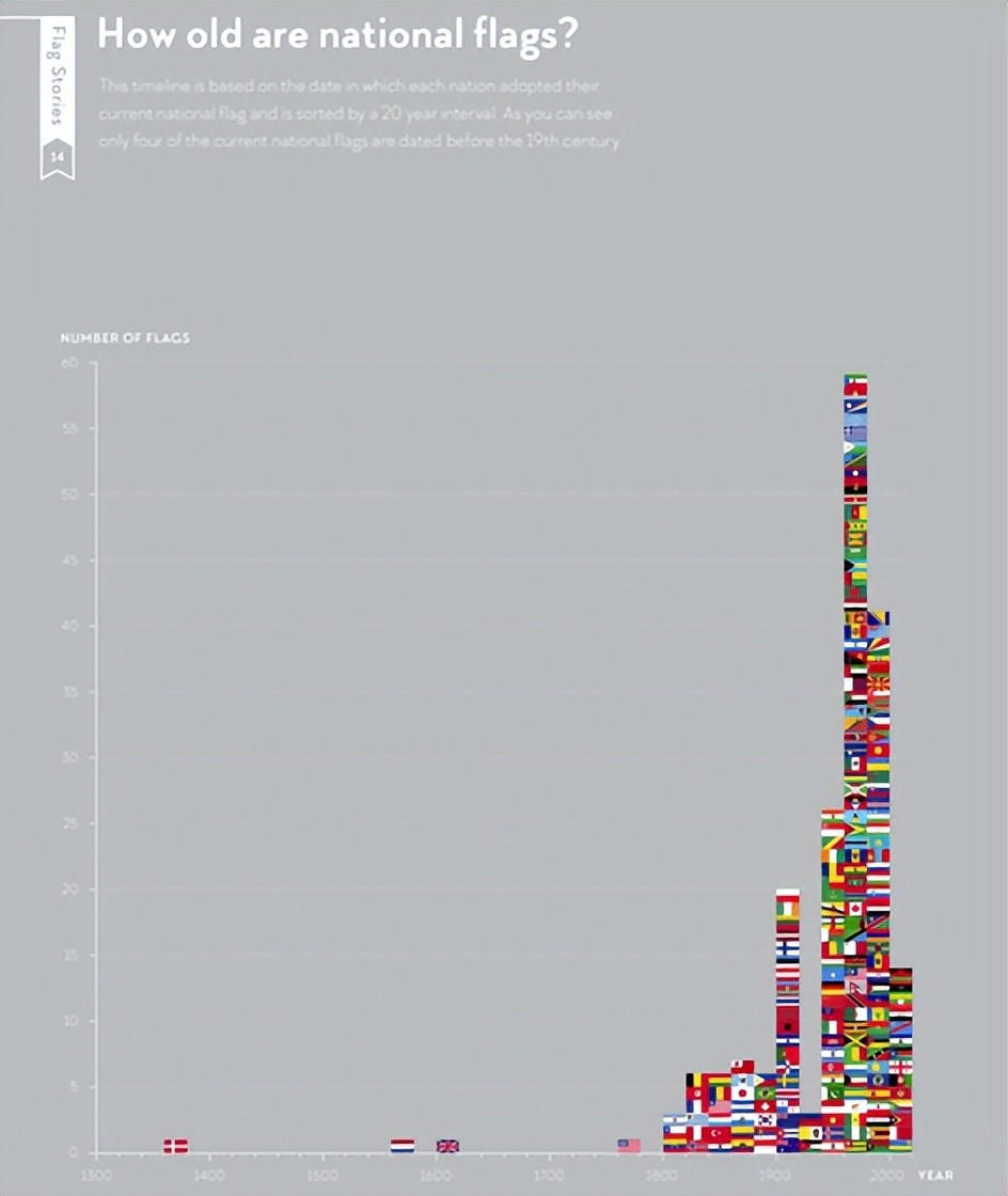 下图显示了各国建立国旗的年份。您可以看到,丹麦,荷兰,英国和美国只有4面旗帜,甚至在19世纪之前就已经建立和使用。