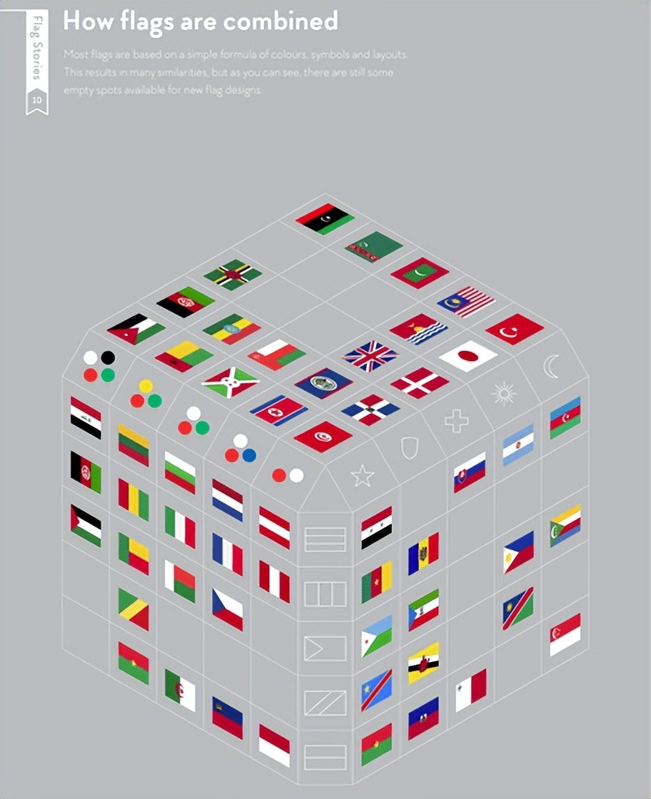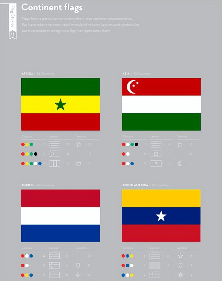 国旗分为彼此相似的颜色和符号,如下所示。创建新标志时,如果使用当前未使用的颜色和标记的组合进行设计,则可能会起作用。