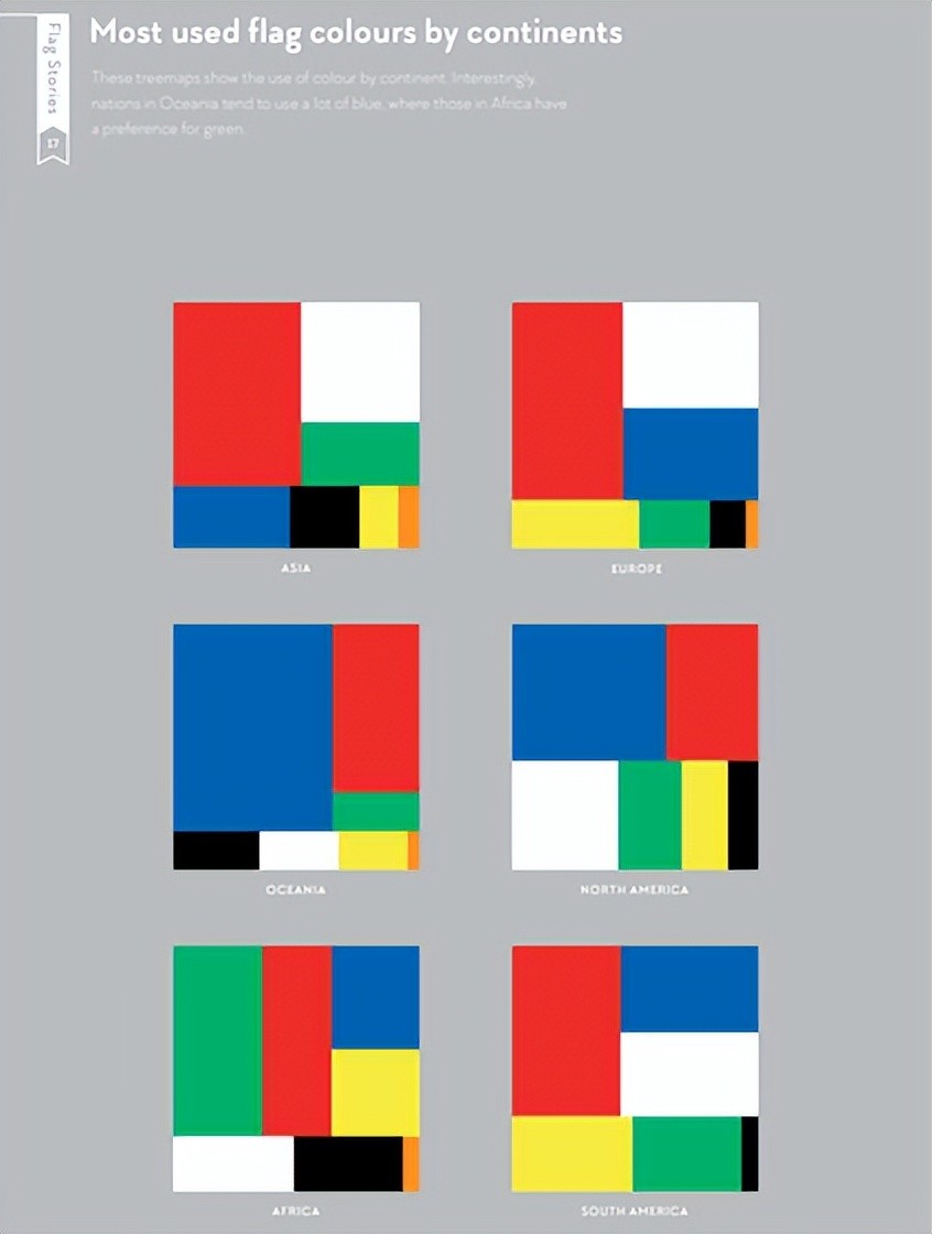 旗帜的颜色按以下方式划分为各大洲。似乎蓝色在大洋洲大陆使用,包括澳大利亚和新西兰,绿色在非洲经常使用。