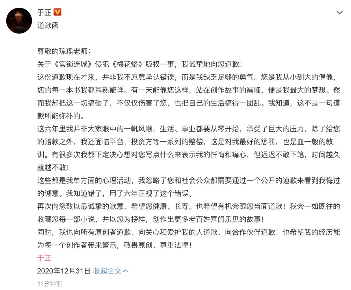 刚刚,于正发文就《宫锁连城》侵犯《梅花烙》版权一事向琼瑶道歉。
