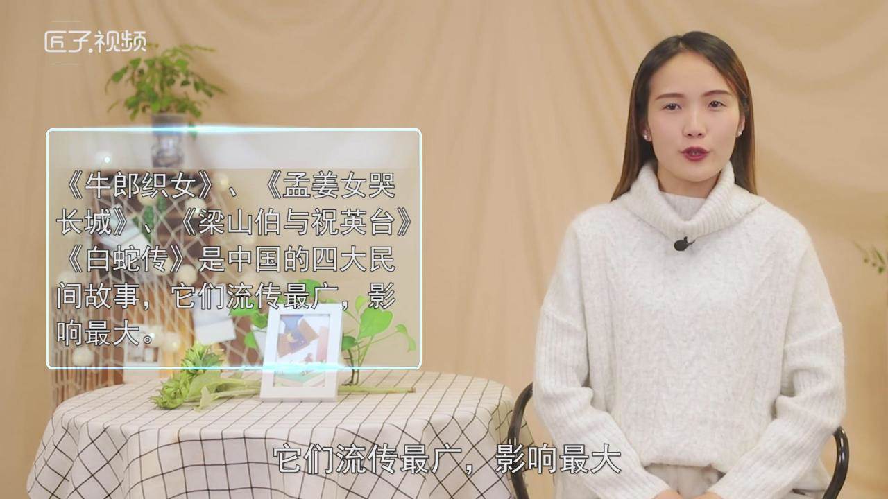 《牛郎织女》、《孟姜女哭长城》、《梁山伯与祝英台》、《白蛇传》是中国的四大民间故事,它们流传最广,影响最大。