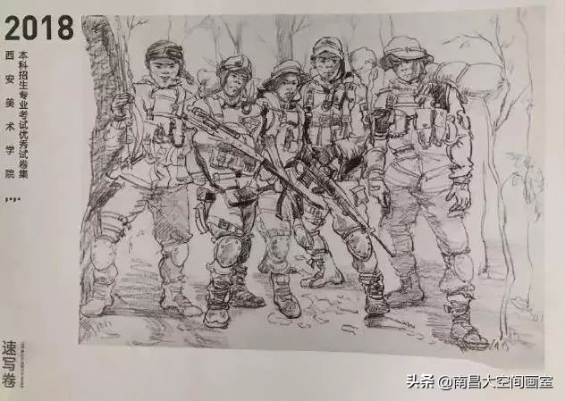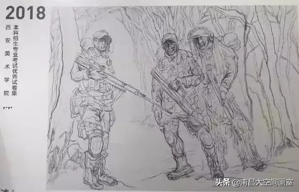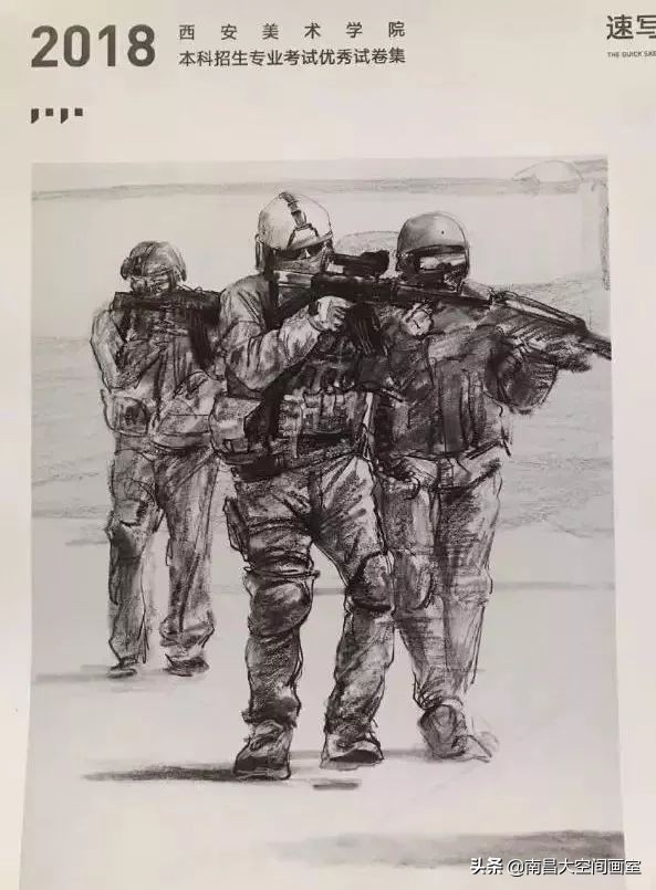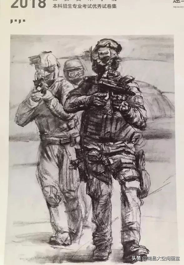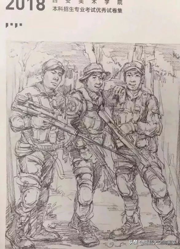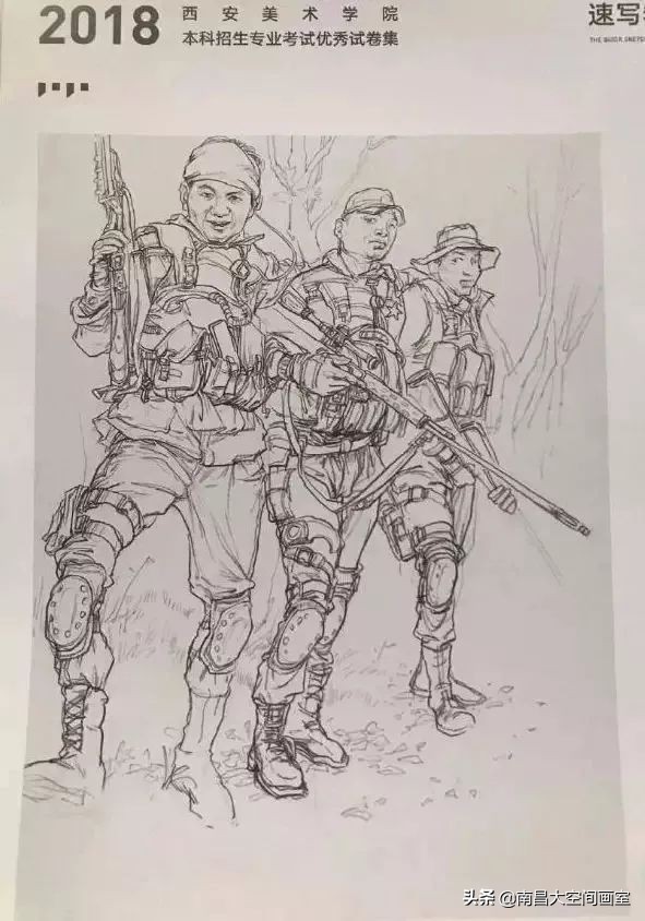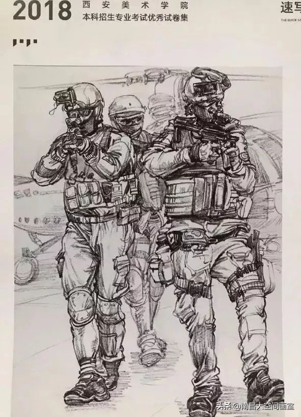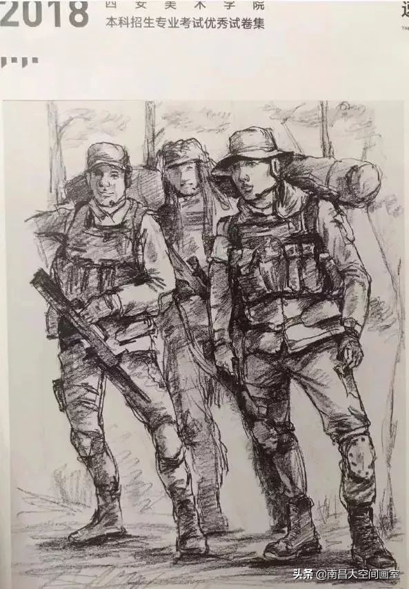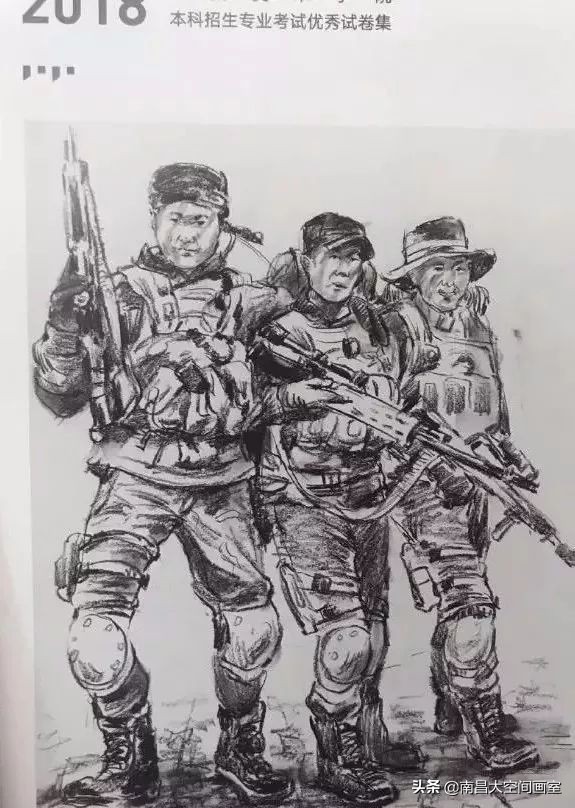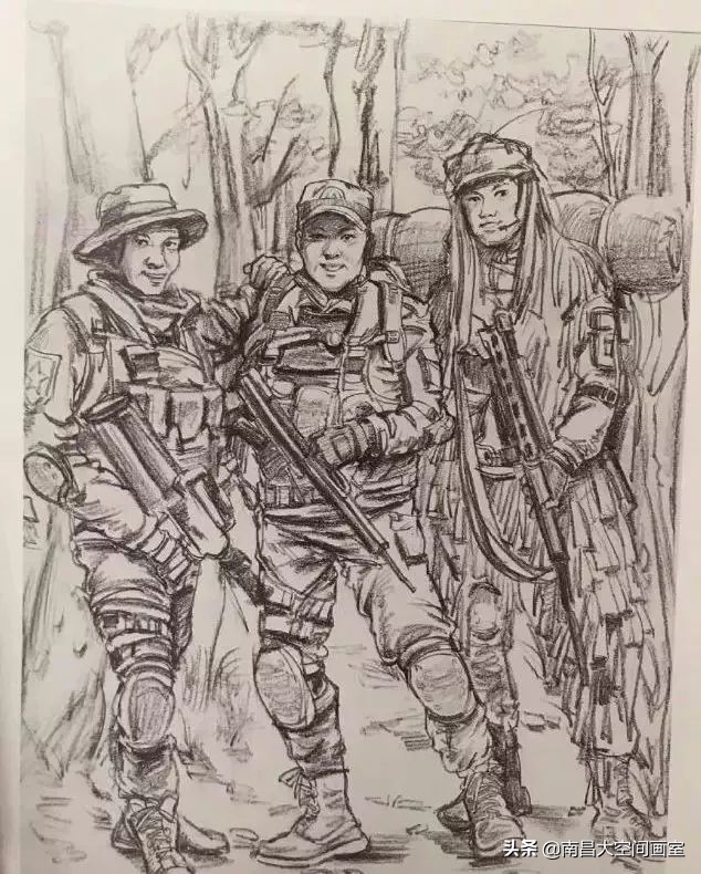 速写考题:军人迷彩服照片,选任三个人集合背景画一幅场景。