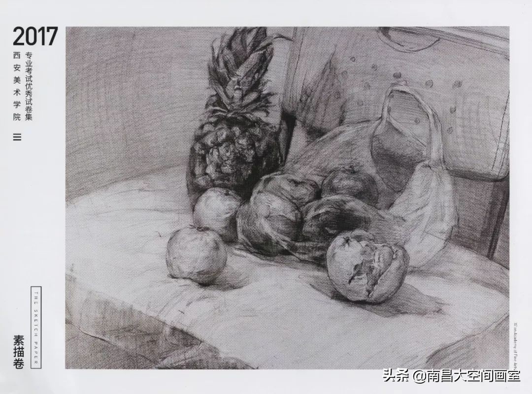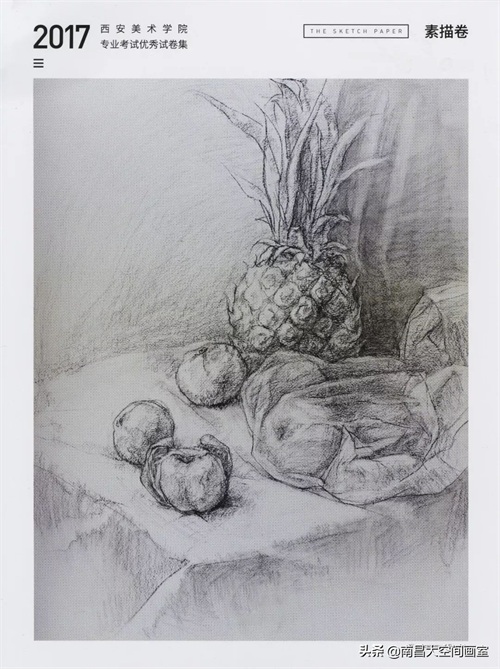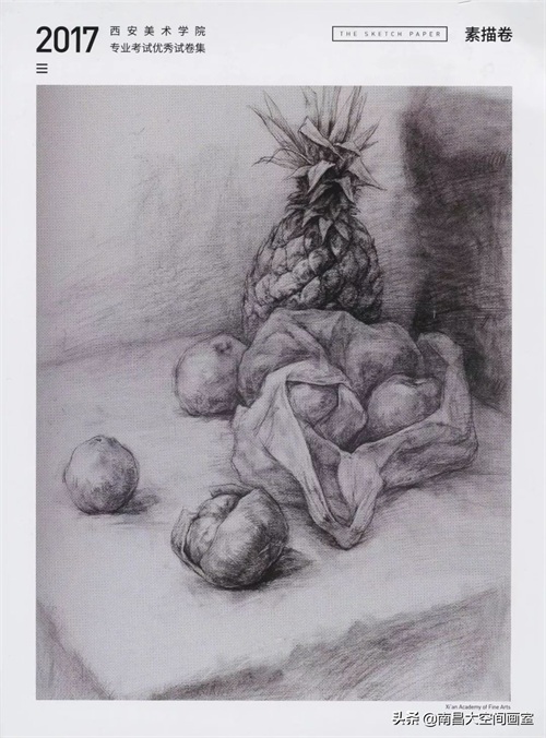 素描考题:素描静物,菠萝和五个苹果,两个橘子,有三个苹果在塑料袋里,一个在塑料袋上,一个是切开,平铺白布一块;