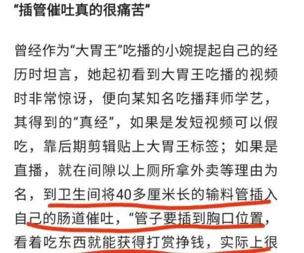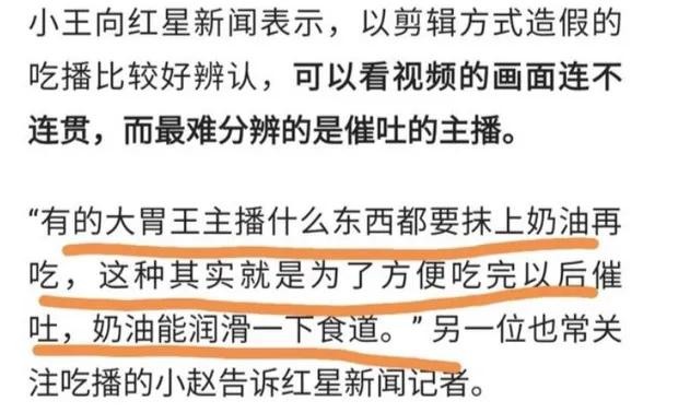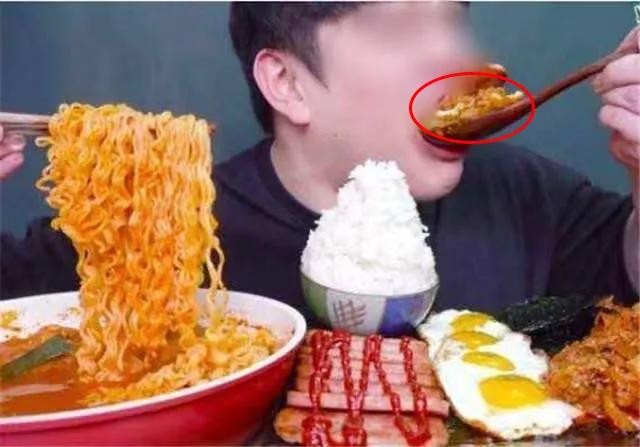 一些吃播中我们只能看到主播将食物塞进嘴里的画面,其实这些食物并没有被吞咽,而是被吐了出来。有的博主只吃少量食物,做出逼真吞咽的效果,实际上可能并没有吃完。