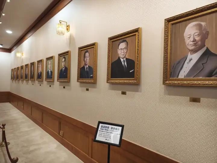 一层的左右两侧有几个可以打卡拍照的会议室,其中左侧走到头的大厅,墙上还有历任韩国总统的照片。