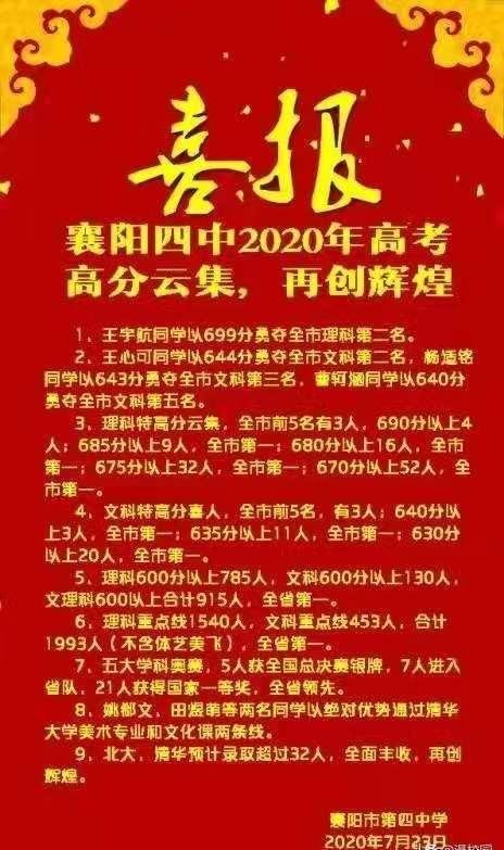 2019年高考,刘雨桐以676分夺得湖北省文科第一名,周哲恺以710分夺得湖北省理科应届第一名,吴玥以667分夺得湖北省文科第三名;文科全省前10名,四中3人,全省第一;理科全省前10名,四中3人,全省第一;理科700分以上全省12人,四中3人,全省第一;690分以上9人,全省第一;680分以上17人,全市第一,全省领先;17人裸分考入北大清华,北大清华正式录取30人;理科一本重点线1591人,文科一本重点线344人,文理科一本重点线1935人;加上体艺美等一本线,突破2000人;五大学科奥赛29人获得国家一等奖,3人进入省队,获得全国总决赛一金一银一铜三枚奖牌,刷新鄂西北奥赛新记录;自主招生27人次获得北大清华加分,全市第一,全省领先;空军招飞、南航招飞定选合格21人,全省第一,为襄阳人民争得了荣誉。