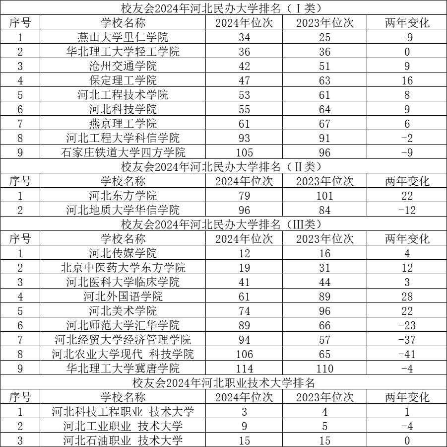 校友会2024年河北民办大学排名(Ⅰ类):燕山大学里仁学院第34位、华北理工大学轻工学院第36位、沧州交通学院第42位、保定理工学院第47位、河北工程技术学院第53位、河北科技学院第55位、燕京理工学院第61位、河北工程大学科信学院第93位、石家庄铁道大学四方学院第105位。