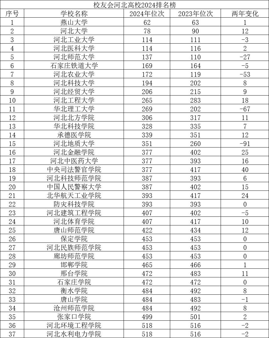 校友会2024河北高校排名:燕大第1,河北大学第2、河工大第3