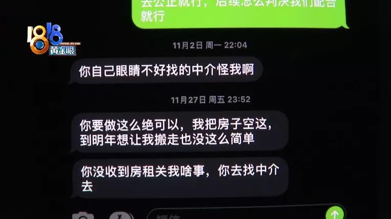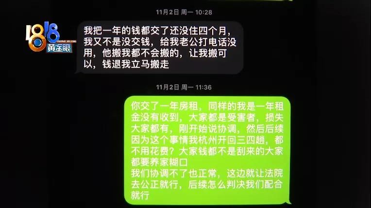 李女士说, 双方从去年8月份开始协商,一直协商到去年11月份。她提供了一段短信记录,说是丈夫和租客邹先生的妻子的沟通记录。去年11月2号上午,对方表示“给我老公打电话没用,他搬我都不会搬的,让我搬可以,钱退我立马搬走。