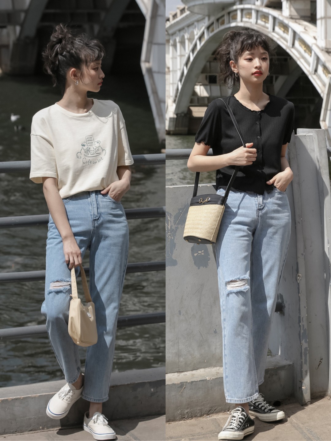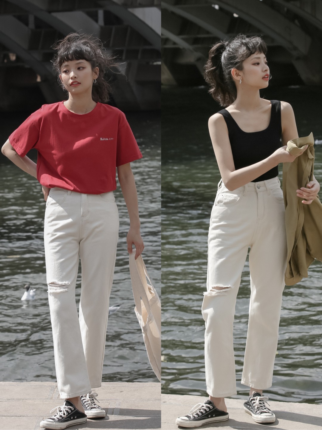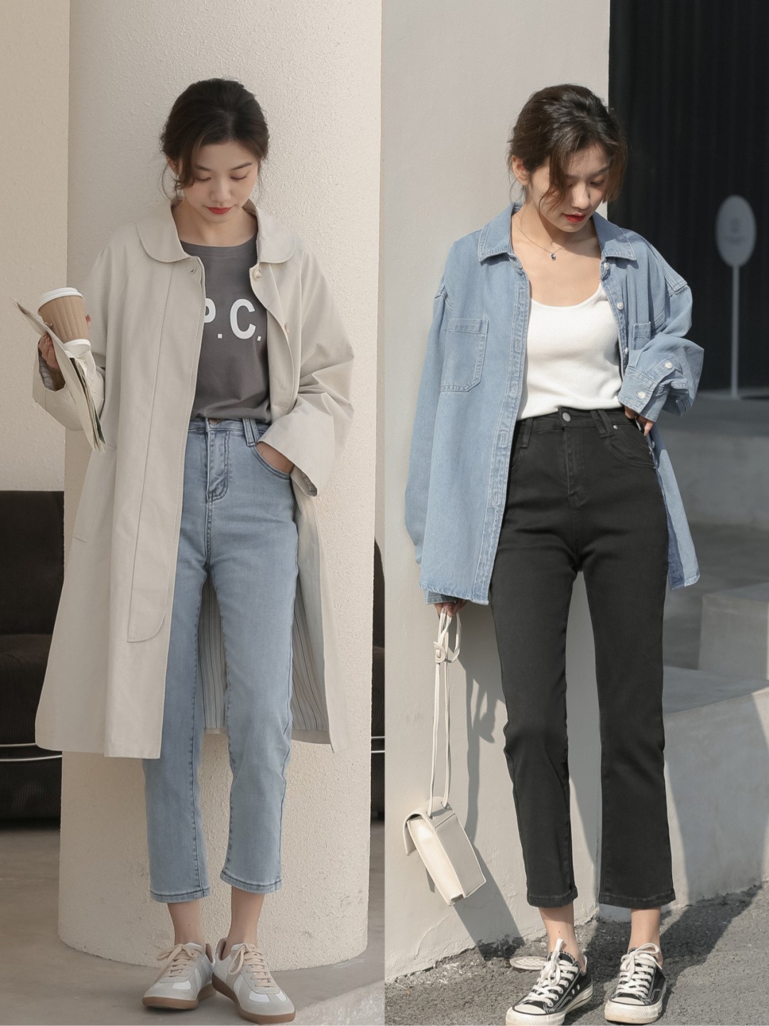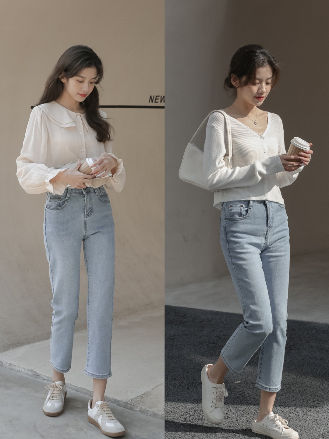 春夏季节选牛仔裤,推荐姐妹们多考虑浅色。浅色的牛仔裤更清爽,春夏穿也不会觉得太厚重。