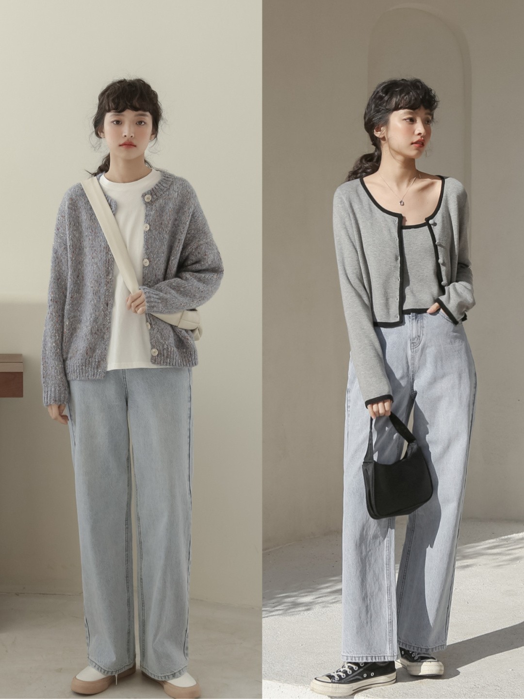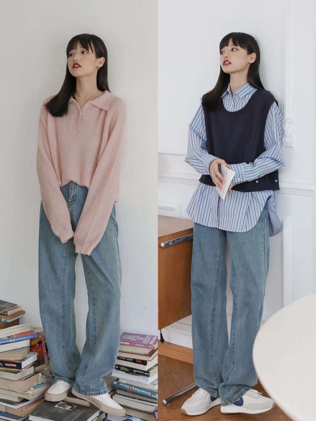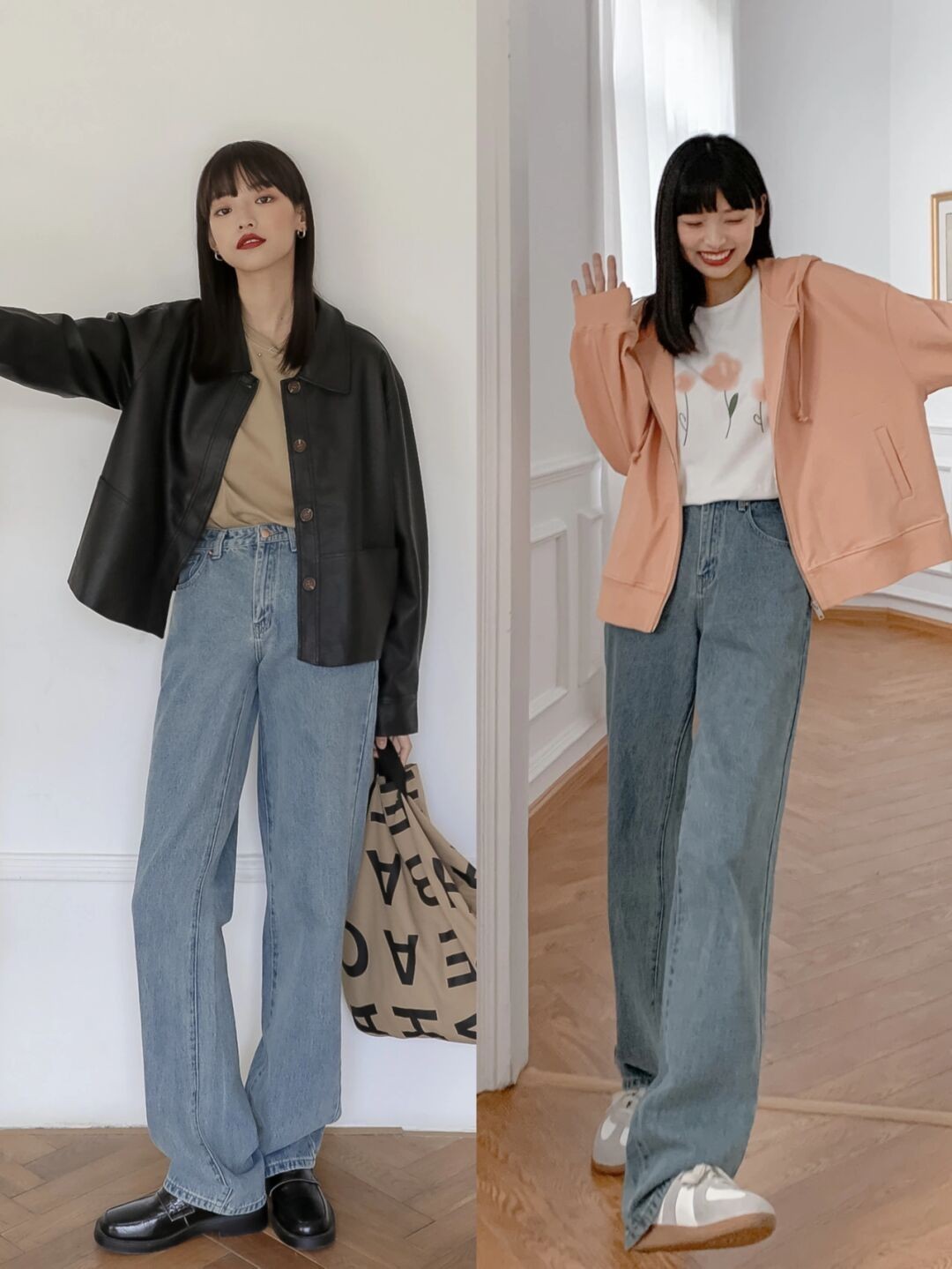 如果你的腿还算比较细,只是腿型不好看,我推荐你可以用直筒裤来凹造型。直筒牛仔裤简洁利落,比宽松的阔腿裤更加耐看,没有很明显的厚重感以及累赘感。