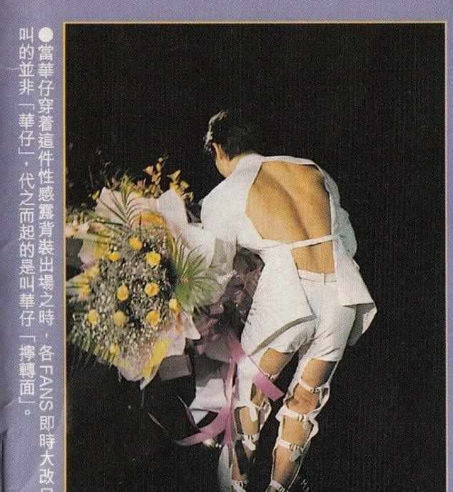 本以为这套穿搭除了前面露点,其他都是非常正常的,结果在翻阅另一张背面照片时,惊呆了小编,原来背后的设计更加大胆,背部几乎完全裸露,只用一根布条连接衣服中间,更加让人震惊的是裤子如同现在的破洞裤一般,几乎裸空,只剩少许的布条遮挡着。得亏华仔生在了那个年代,否则必定会引起粉丝尖叫狂欢,甚至会被扒得连衣服都不剩的。