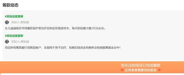 在 " 项目进度更新 " 中,发起人表示 " 女儿涵涵现在华西重症监护室治疗目前还在昏迷状态,每天的花费大概 1 万元左右。"" 项目所有筹款都打到医院账户,全部用于孩子治疗,如果后续资金有剩余会转捐慈善基金会中。"