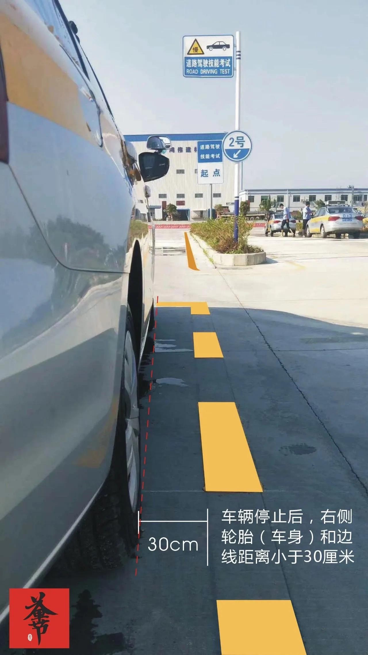 科二侧方停车:入库之前停车的时候,车身右侧离边线30公分最合适。