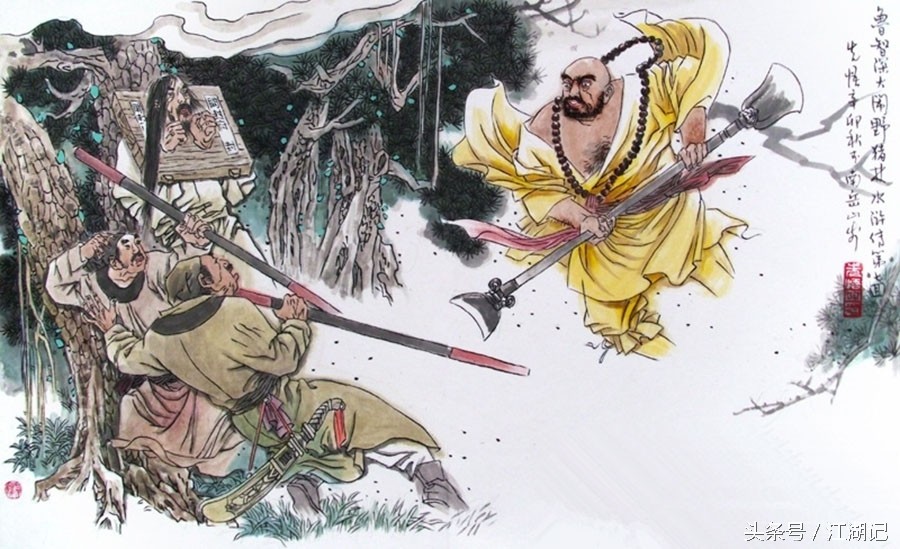 于是这董超和薛霸,先在客店设计用开水烫伤了林冲的脚,让他失去行动能力。等来到野猪林,两公差又设计用绳子把林冲绑在大树上,薛霸提起水火棍望林冲脑袋上劈将来——董超和薛霸,怎么也不会料到这时有一条禅杖飞了出来!林冲已然束手,但那拿着六十二斤禅杖的鲁智深,却是BOSS级的怪物,硬生生地把林冲救了下来!