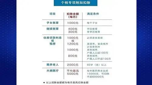 子女教育,从3岁开始,学前教育直到博士研究生,全日制教育,不论国内或者国外,不论公办或者民办,不论普高、职高、技校,都可以选择父母全额或者减半扣除,扣除主体可以是生父母、养父母、继父母、或者父母之外的其他监护人;计税是以年度开始计算,寒暑假不中断;全额或者减半的意思是一个子女的额度是1000元,可以由父母各扣500元或者由父/母单独一方扣1000元;多个子女可以累加,一个额度是1000元,两个就是2000元,三个是3000元了。继续教育,包括学历继续教育(学历/学位)、技能培训考证;大病医疗,医保报销后的医保目录范围内的个人自付部分累计超过1.5W的,限额扣除8W/年,可以扣本人或者配偶,未成年子女医药费由父/母扣除;职业资格证书要参考国家职业资格目录。住房贷款利息,首套住房贷款利息,可以扣除1000元/月,不超过240个月;本人或者配偶单独或共同的,商业贷款或公积金贷款的,可以夫妻减半扣除或者一方全额扣除。但是住房贷款利息与住房租金这2项专项附加,只能扣一个。租房租金,自己或者配偶没有自住房,有实际租房,抵扣按城市标准扣除,直辖市、省会、计划单列市以及国务院确定的其他城市,可扣除1500元/月;市辖区人口过100万的,扣1100元/月;不超过100万的扣800元/月。赡养老人,按2000元/月,独生子女满额扣2000元/月,非独生子女分摊扣这个额度。赡养老人可以是满60岁的父、母或者祖父母、外祖父母(子女均去世)。