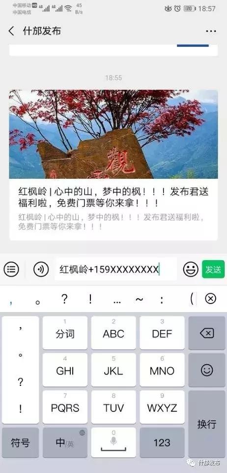 门票获得方式 :通过下方“了解更多”进入“什邡发布”微信公众号并关注。给“什邡发布”发送关键词“红枫岭+电话号码”,即可参与抽取免费门票,名额200,每人将获得红枫岭门票一张。大家都来参与吧!。