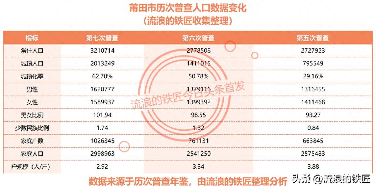 先来看看最近3次人口普查,莆田市的基本人口数据变化情况
