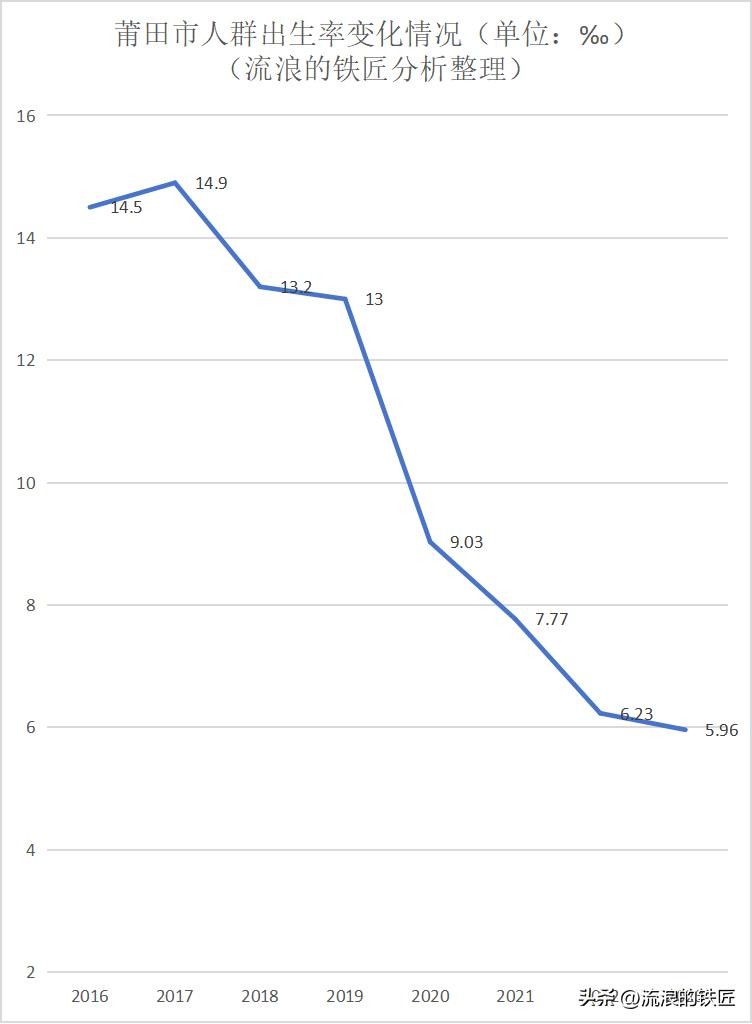 上表中,我们可以看到,莆田市的人群出生率从2017年的14.9‰下降到了2023年的5.96‰,下降幅度惊人。我们知道,在上世纪60-70年代,莆田市的人群生育率大约在44‰左右。