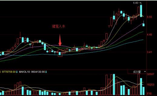 “猪笼入水”是指个股经过低位收集后开始的猛烈拉升,在高位形成尖顶后,单边下行不做头部的确认动作,在接近60日或150日均线时,以一根中阴线向下突破,走势吓人,但5曰乖离率出现明显背离,这是缩量洗盘结束的最佳买点。随之而来的将是一波向上攻击前期高点的行情。