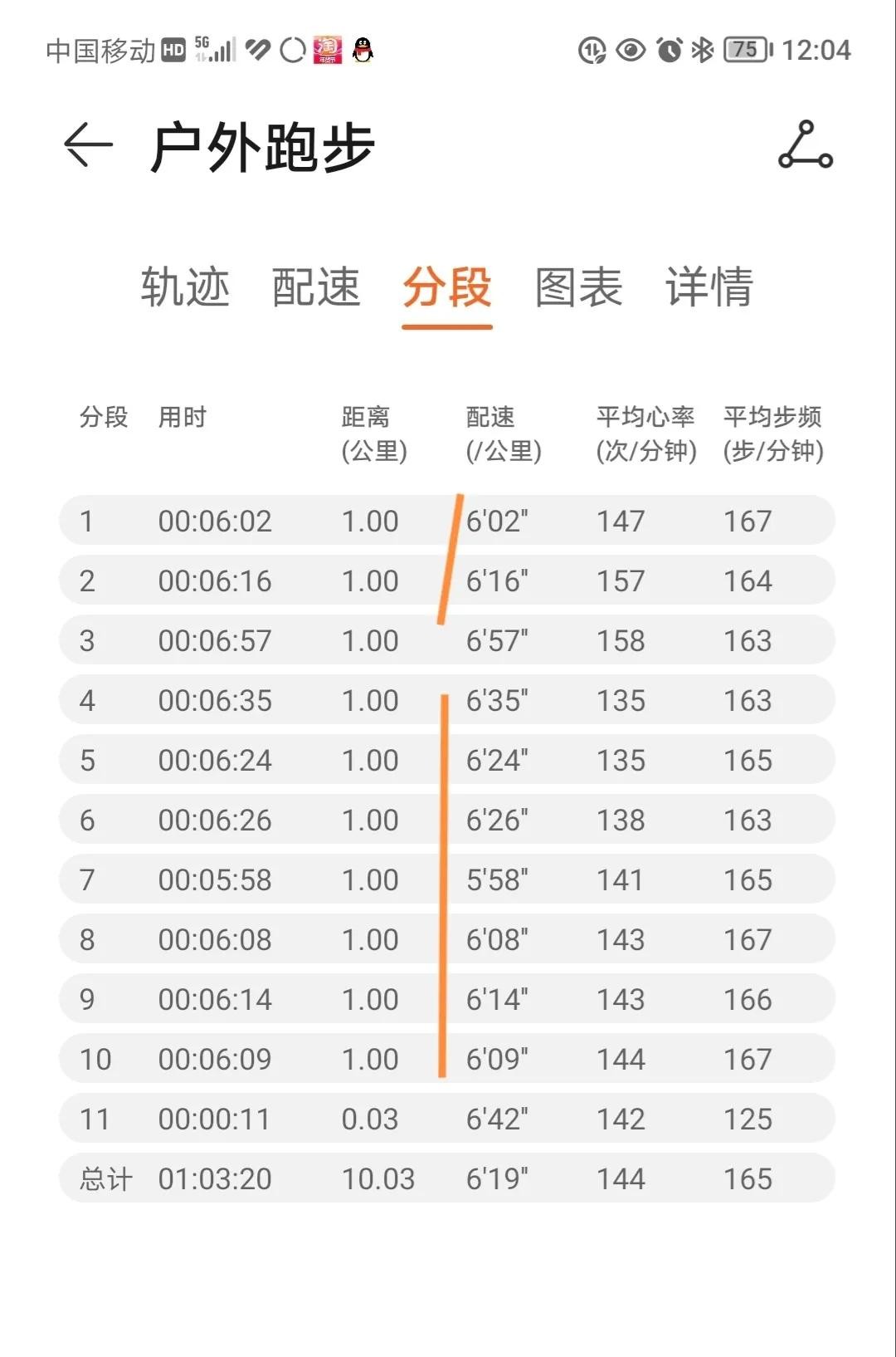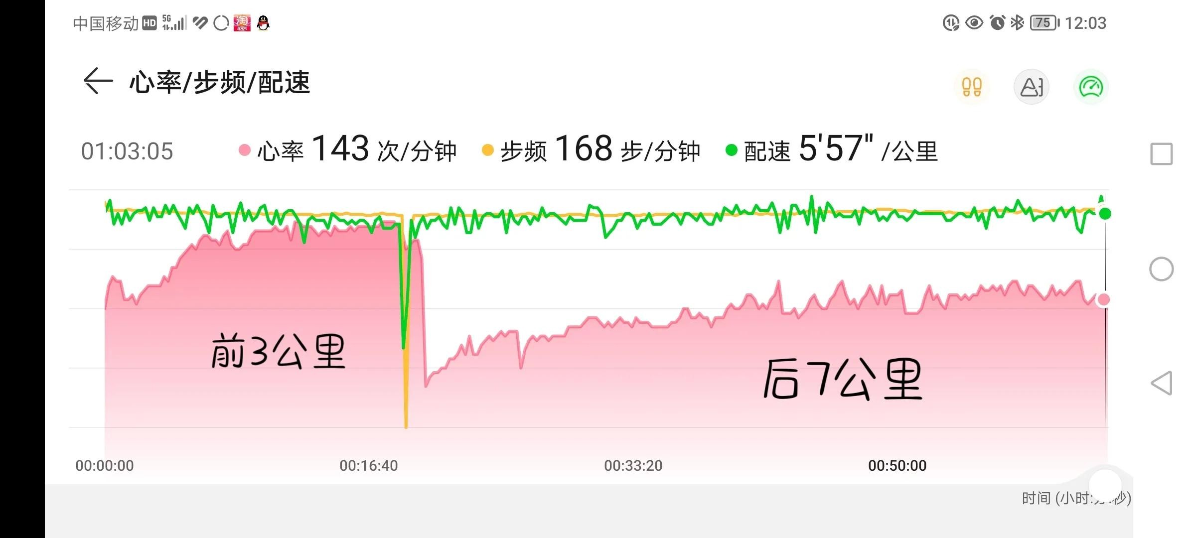 整个10公里跑步过程中,配速和步频都比较平稳,而心率在前3公里和后7公里可以说是天壤之别,见下图: